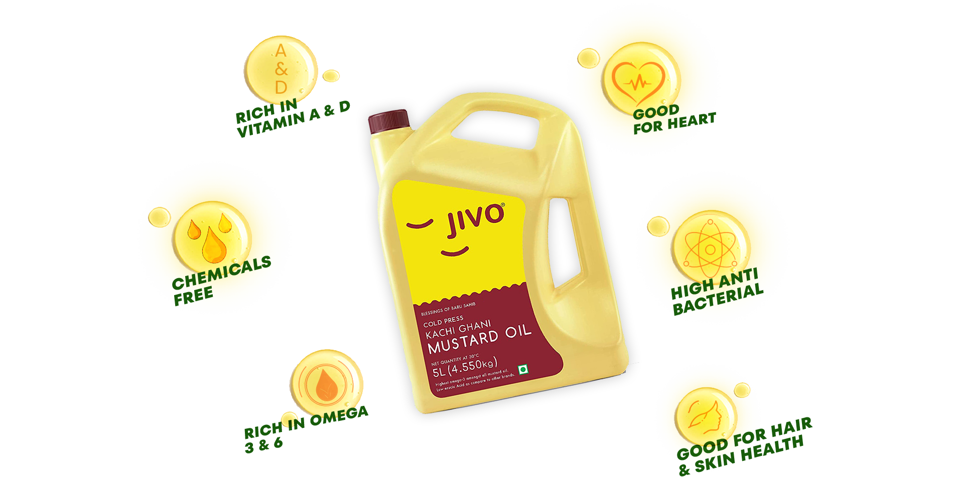 Jivo's Kachi Ghani Mustard Oil benefits the skin by providing deep nourishment and promoting a healthy, glowing complexion. Its high content of omega-3 fatty acids helps maintain skin hydration and elasticity, reducing dryness and signs of aging. Mustard oil is also rich in antioxidants, such as vitamin E, which help protect the skin from environmental damage and oxidative stress, preventing premature aging. Additionally, its antimicrobial properties can soothe irritated skin, making it a great natural remedy for skin conditions like acne or eczema. Regular use of Jivo's Kachi Ghani Mustard Oil can leave the skin soft, smooth, and rejuvenated.