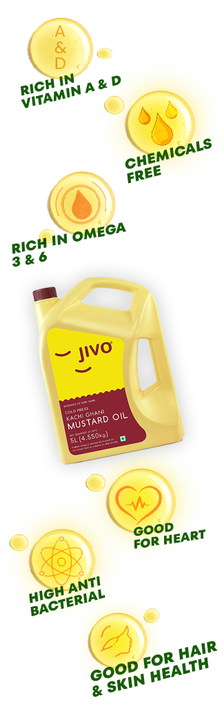 Jivo's Kachi Ghani Mustard Oil supports heart health due to its rich content of monounsaturated and polyunsaturated fats, which help lower LDL (bad) cholesterol and increase HDL (good) cholesterol levels. These heart-healthy fats help reduce the risk of plaque buildup in the arteries, promoting better blood circulation and overall cardiovascular health. Additionally, mustard oil contains omega-3 fatty acids, which have anti-inflammatory properties that further protect the heart. Regular use of Jivo's Kachi Ghani Mustard Oil as part of a balanced diet can help maintain healthy cholesterol levels and support heart function.